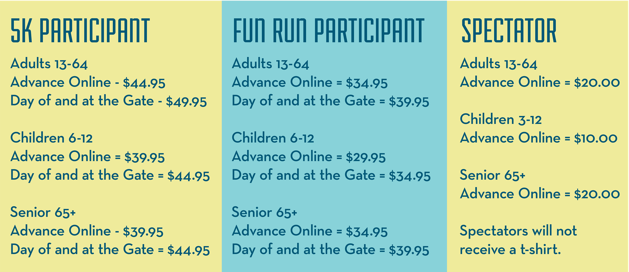 *Ages 5 and under are not required to pay 5k registration. However, a spectator, non-runner ticket will need to be purchased for children ages 3-5 for Aquarium admission.- Guests of race participants are required to pre-purchase a spectator ticket in order to enter campus during and post-race. Spectator tickets can be added during the registration process at checkout and are discounted. The day of the race will be the regular admission price.
