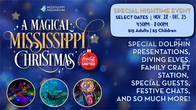 The Aquarium will close to the public for daytime hours at 4:30pm, and gates reopen at 5:30pm for A Magical Mississippi Christmas presented by Gulfport Coca-Cola Bottling Company, UNITED.