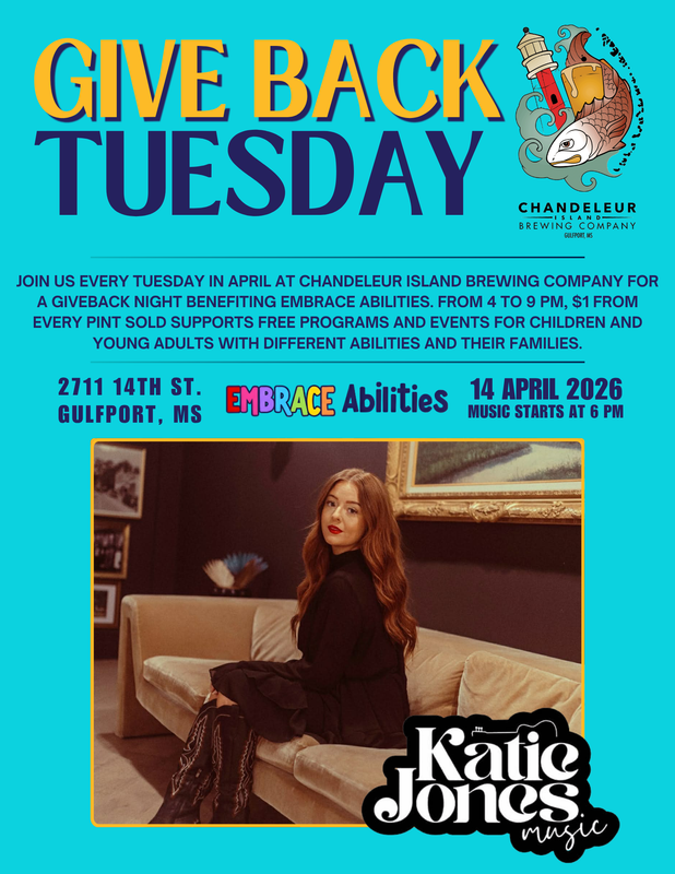 Join us at Chandeleur Island Brewing Company on April 14th for a giveback night benefiting Embrace Abilities, featuring live music from Katie Jones Music from 6 to 8 PM.