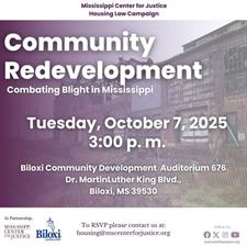Join us as we present information to community-based nonprofits and municipalities about the direct legal services the Mississippi Center for Justice provides to support Community Redevelopment throughout Mississippi.