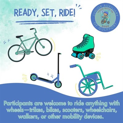 Participants are welcome to ride anything with wheels - trikes, bikes, scooters, wheelchairs, walkers, or other mobility devices. The goal is to have fun and celebrate every rider!